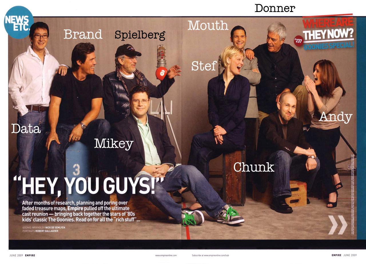 Ich bin beim stöbern durch die internetischen Sphären, auf der Suche nach einem Beitrag-Verschönerungs-Bild auf etwas sehr nettes gestoßen. Und zwar hat das Empire Magazine eine “The Goonies Reunion” im April 2009 organisiert (Photo by Robert Gallagher). Wenn das mal nicht genau das Richtige Bild für meinen Beitrag ist. Schön zu sehen dass sie alle immer noch fabelhaft sind, und der eine oder andere uns immer noch mit seiner Bildschirm-Präsenz beglückt … Mein Favorit natürlich damals wie heute: Corey Feldman (Mouth)
